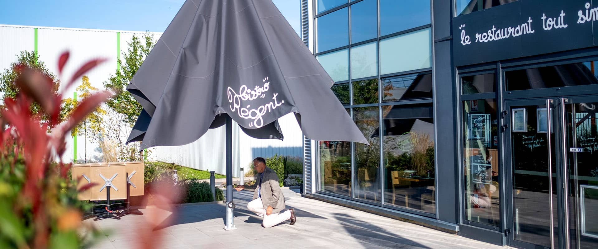 Ici en action : un parasol géant aux couleurs de Bistro Régent.